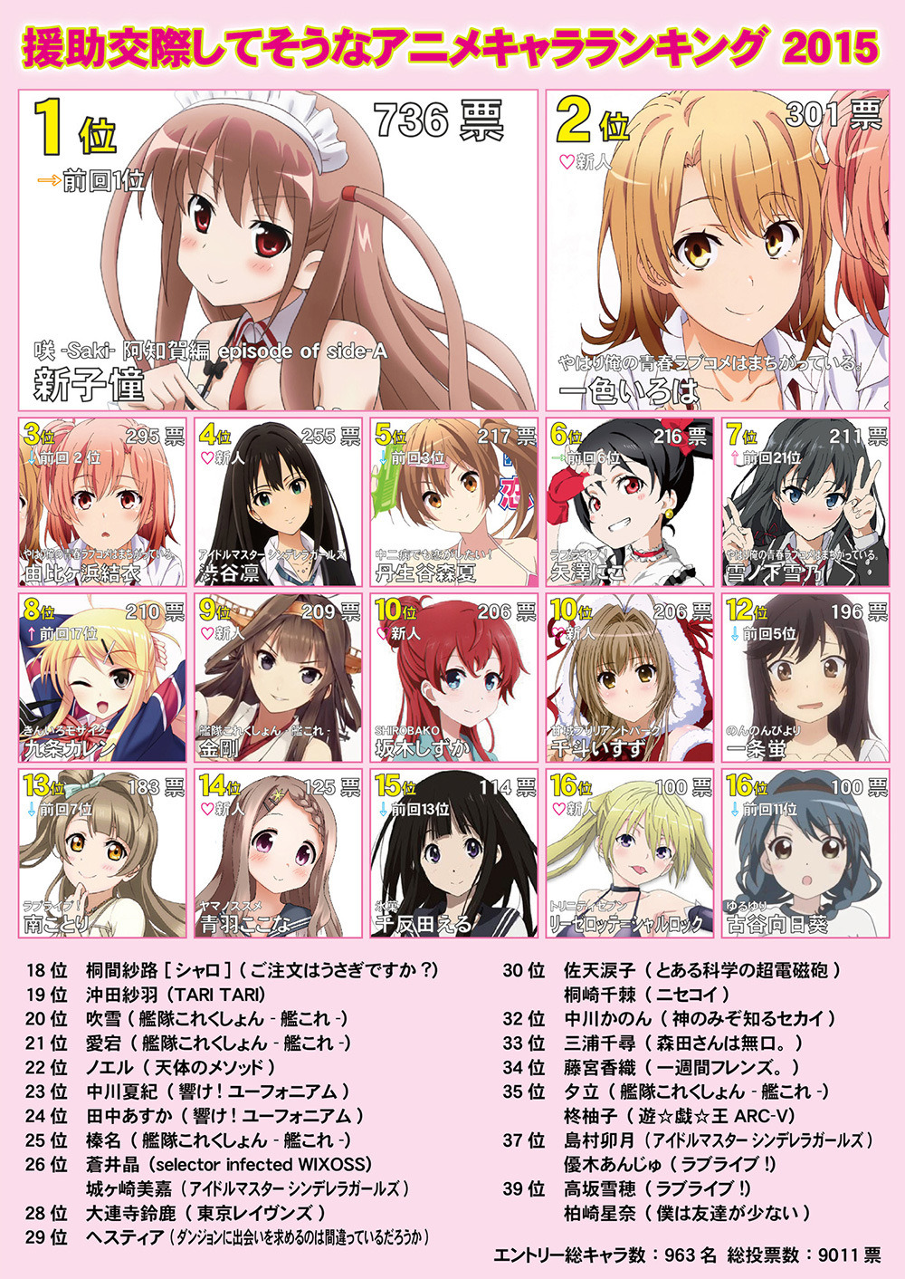 8 名前 : 暇つぶしの名無しさん投稿日:2015年10月05日 10:41 ▼このコメントに返信 ベスト10に俺ガイルキャラ3人も入ってて草